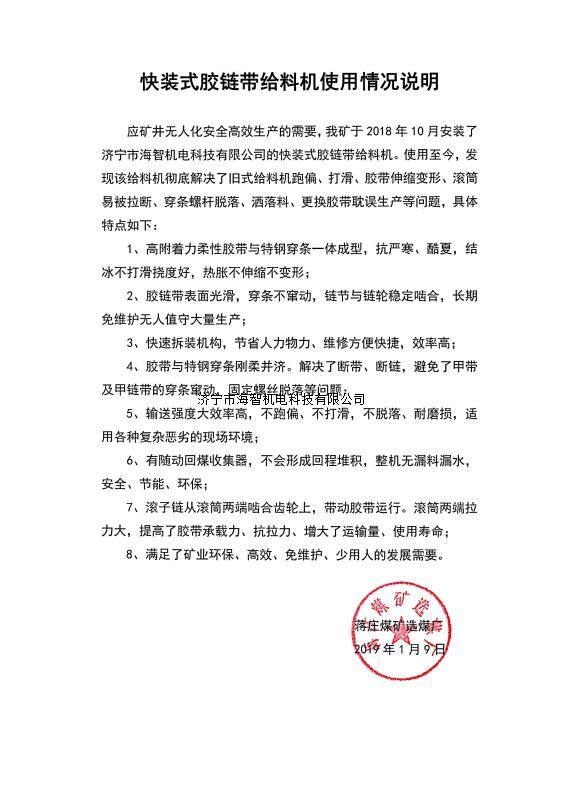 快裝式膠鏈帶給料機(jī)可實(shí)現(xiàn)完美替代物料運(yùn)輸系統(tǒng)在用的所有形式的給料機(jī),包括甲帶給料機(jī)、帶式給料機(jī)、振動(dòng)給料機(jī)、往復(fù)式給料機(jī)、鏈板給料機(jī)等,膠鏈帶給料機(jī)更好的解決了跑偏、打滑、換裝困難等問(wèn)題,更利于實(shí)現(xiàn)快速裝車(chē)、高效自動(dòng)化的現(xiàn)代智能運(yùn)輸系統(tǒng)要求。